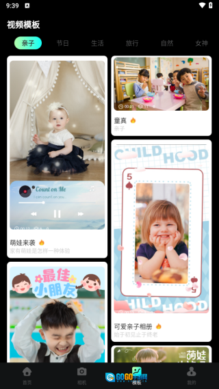 3、底部的模板板块,涵盖亲子、节日、生活、旅行等海量视频模板素材。