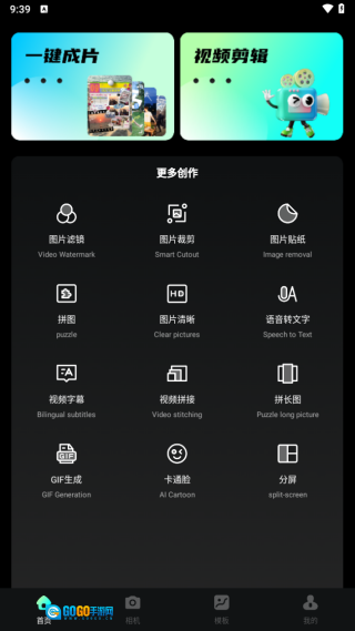 2、进入软件首页,包含智能滤镜、动态照片、人物追踪、变速、色彩调节等诸多功能。