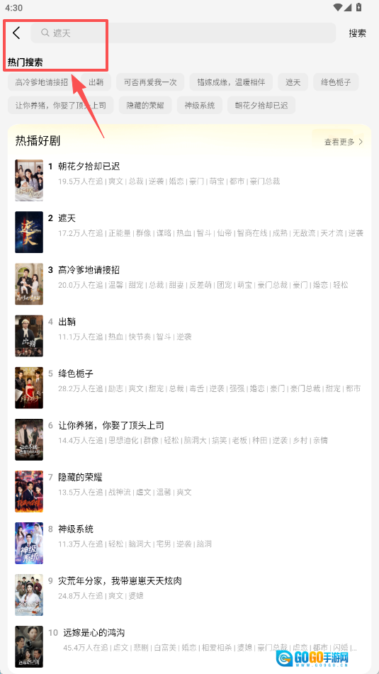 2、进入搜索页面,能点返回箭头或搜索按钮,查热门词看热播好剧。