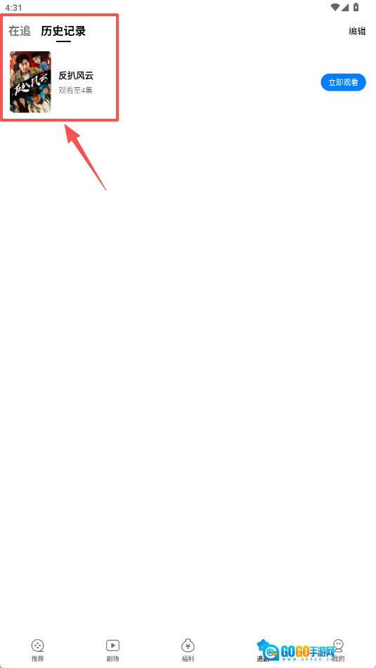 3、打开历史记录,能看到反扒风云观看进度,点立即观看继续追剧。
