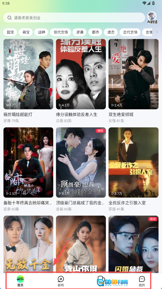 1、打开应用首页,选剧看播放量集数,底部有功能导航按钮。
