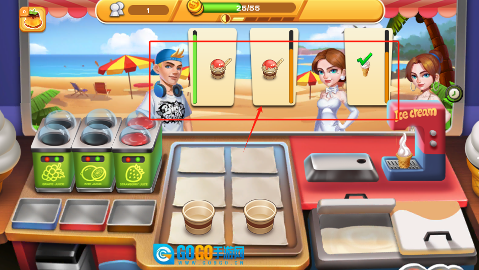 3、继续制作冰淇淋与饮品,当前进度为25/55份,需留意顾客所需是牛奶还是可乐。