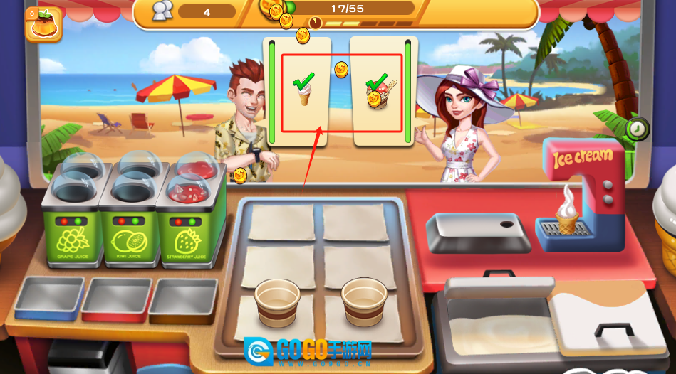 1、点击红框内的冰淇淋图标,根据提示制作0/55份冰淇淋,先完成第一份。