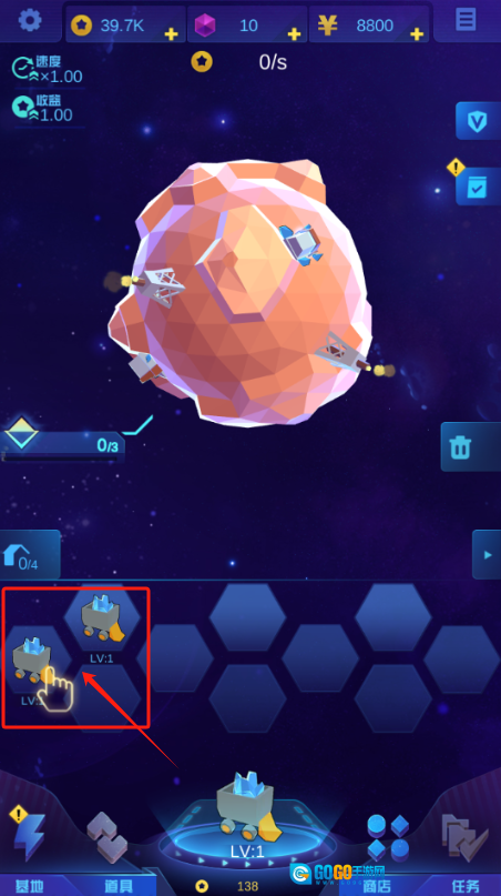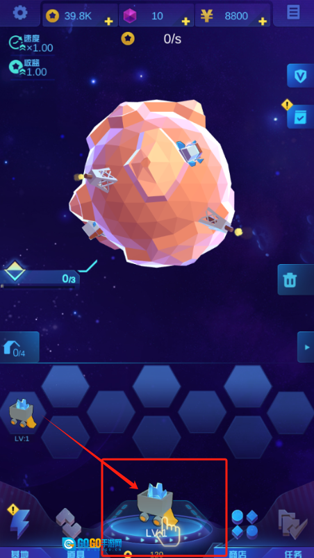2、把钱攒够后,点击红框内的设施进行升级,这样可以提升采矿的速度以及收益的倍数。