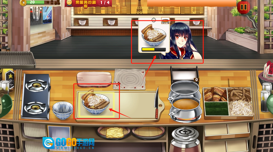 3、在厨房里,按顺序点击食材和厨具制作拉面。