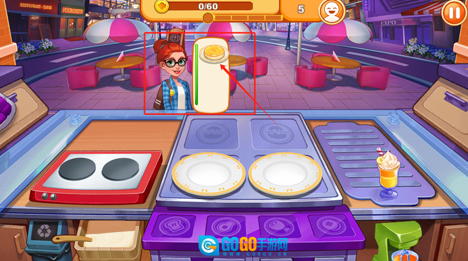 3、按照箭头所指的方向将食物递送给顾客,当完成60份订单后,就可以解锁新的厨具了。