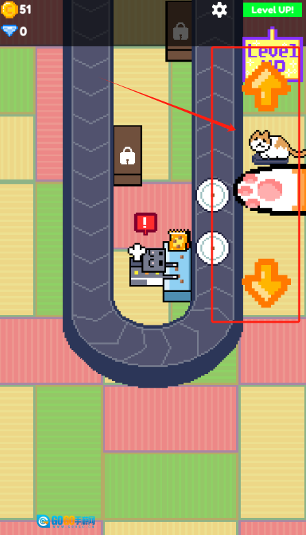 1、点击按钮确认升级后,小猫就会欢快地跑进新解锁的小房子里。