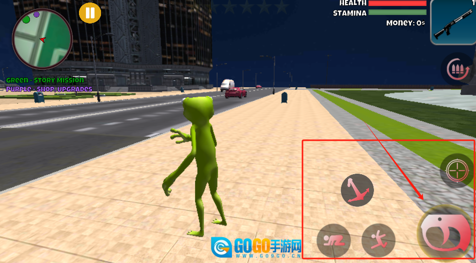2、操控绿色小人移动,点击右下角红框内的爪子按钮来抓取物品。