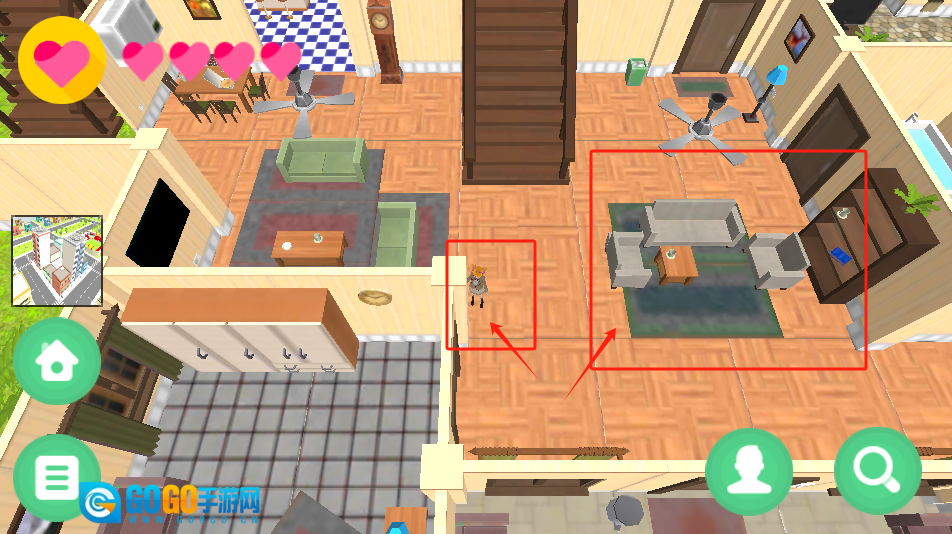 3、对房间内的家具进行布置,点击沙发开展互动,通过探索地图来解锁更多场景。