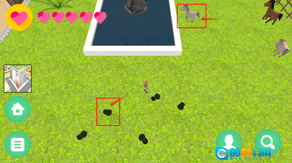 2、清理草地上的马粪,照料马匹饮食,收集各类资源以升级农场的各项设施。