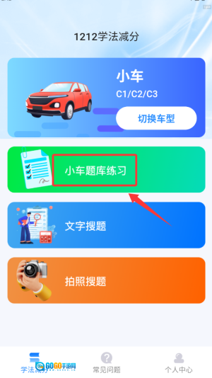 进入1212学法减分应用后,在首页找到并点击“题库练习”功能选项,即可进入驾考题目分类界面。