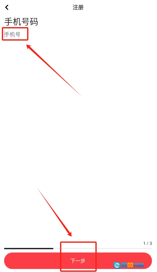 3、点击注册按钮后,按照页面提示的步骤输入手机号码,输入完毕后点击页面下方的“下一步”按钮。