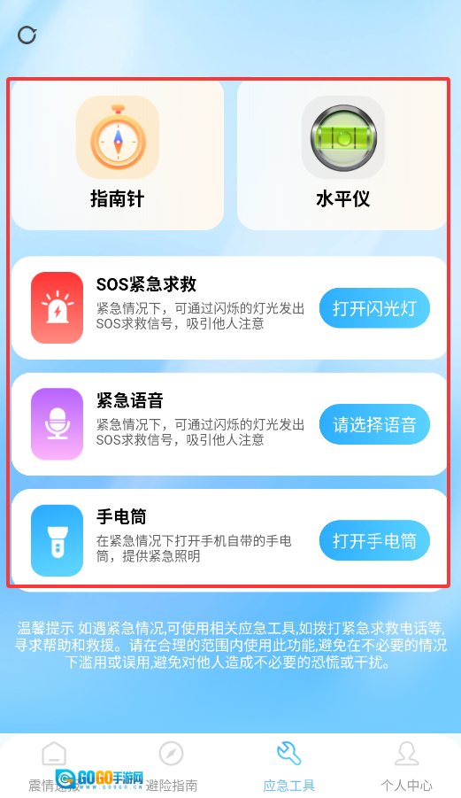 3、"应急工具箱"整合了指南针、求救信号、照明等实用功能,可满足紧急状况下的各类需求。