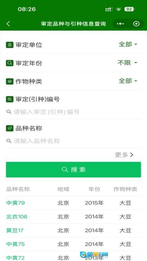 2、审定品种查询:包含主要农作物审定品种数据库,能够查看品种审定公告、特性描述等全部信息。