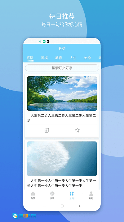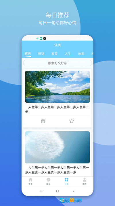 1、先在手机的应用商店里下载安装优优文案,安装完成后打开应用,接着浏览首页上展示的各类文案分类板块。