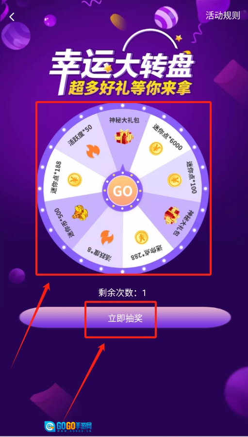 3、进入幸运大转盘界面后,轻点“立即抽奖”按钮,就有机会获得迷你点、活跃度等实用奖励。