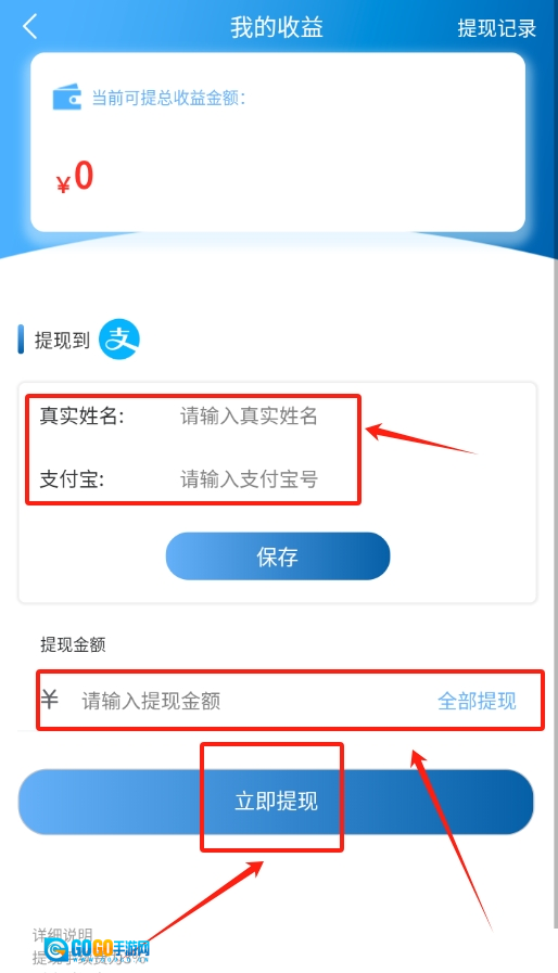 3、登录成功后,进入“我的收益”板块,填写并保存支付宝账号,输入提现金额,最后点击“立即提现”即可。