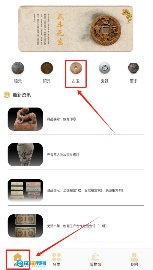 1、启动古董大全应用程序,在首页的各类功能选项中,定位到“古玉”专区并点击进入。