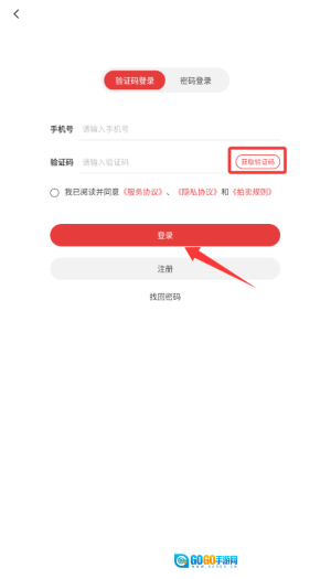 2、点击界面左上角的“登录/注册”按钮,进入手机验证页面,为账号绑定做准备。