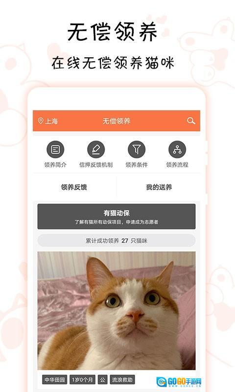 2、如果您有领养猫咪的需求,可以点击“猫咪无偿领养”板块,浏览里面的可领养猫咪信息,挑选出您心仪的对象后,按照流程提交领养申请即可。