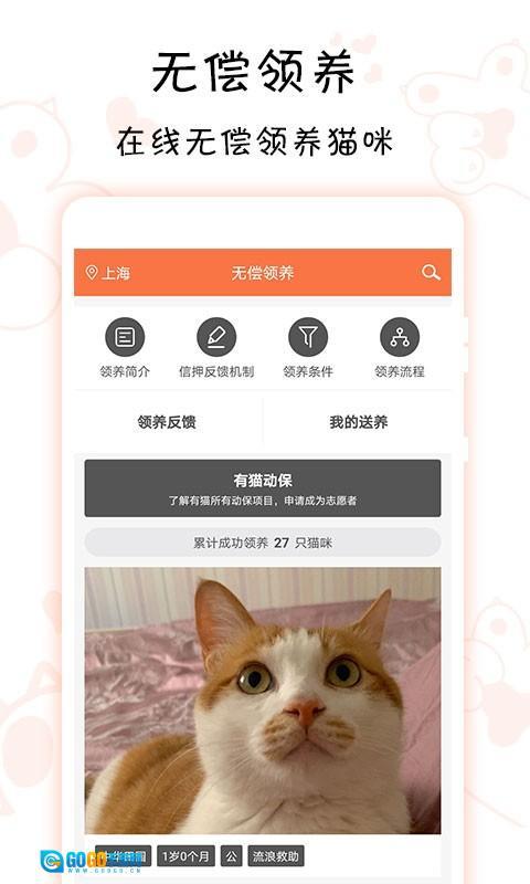 2、设有猫咪无偿领养服务板块,借助线上及线下领养店的资源,对流浪猫送养流程进行优化,助力领养人更快捷地领养到健康的猫咪。