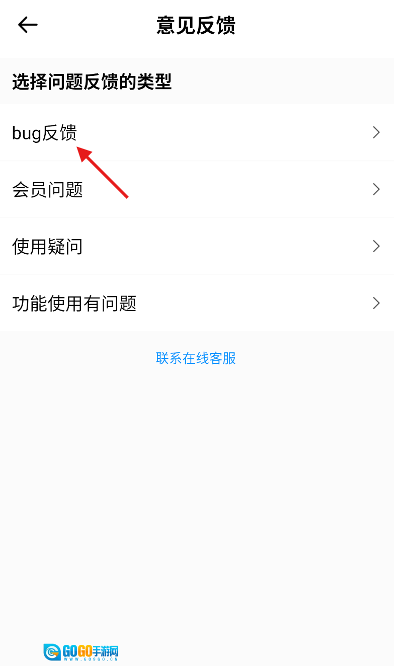 4、进入反馈类型选择页面后,点击“bug反馈”选项,以此明确所反馈问题的具体类别。