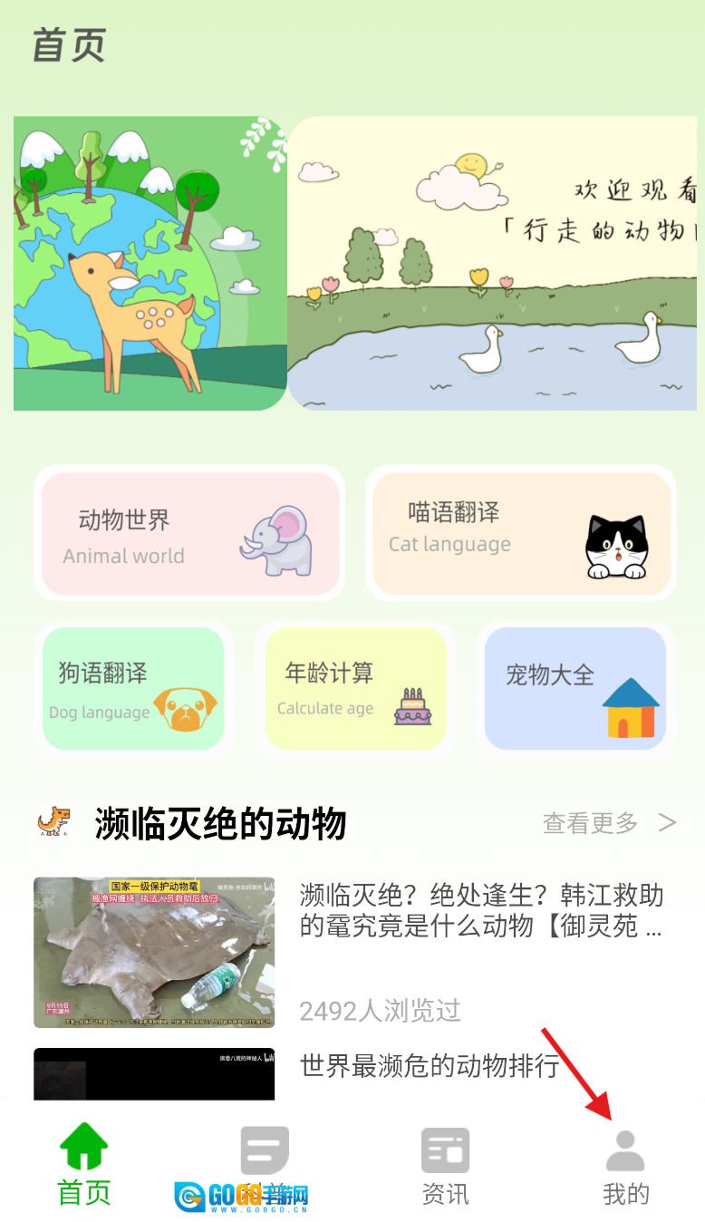 1、打开动物世界大全应用,在主界面底部找到“我的”选项并点击。