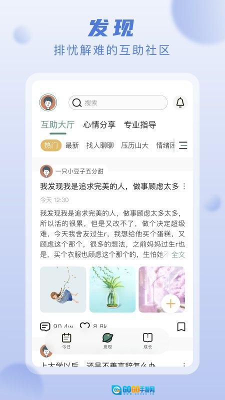 2、点击“发现”进入互助社区,既能自由分享心事,也能为他人提供帮助;点击“今日”,还能进行专业的心理练习。
