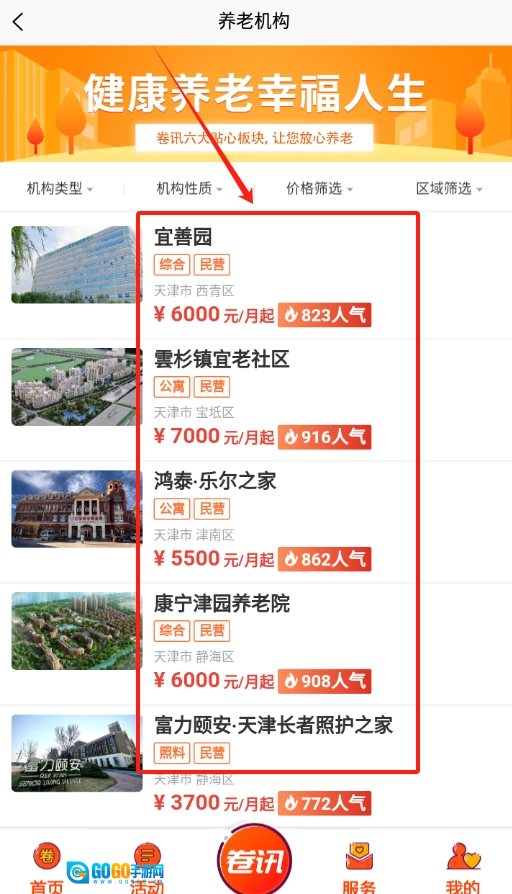 3、进入养老服务板块后,这里罗列着大量养老机构的信息,您只需挑选一家符合心意的,通过联系就能开启相应服务。