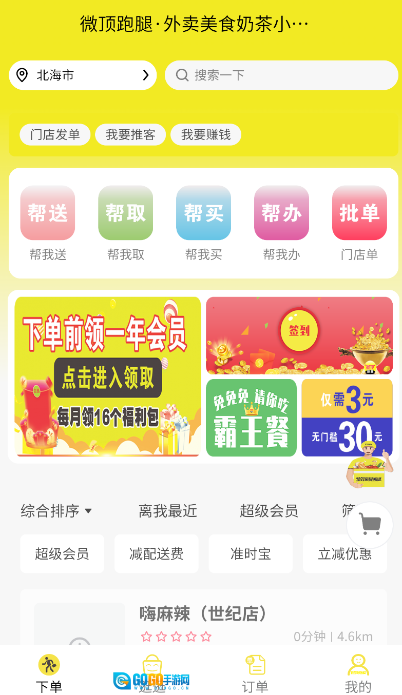 2、选择服务类型:打开应用后,依据自身需求在首页点击“外卖”或者“跑腿”选项,即可进入相应的服务页面。