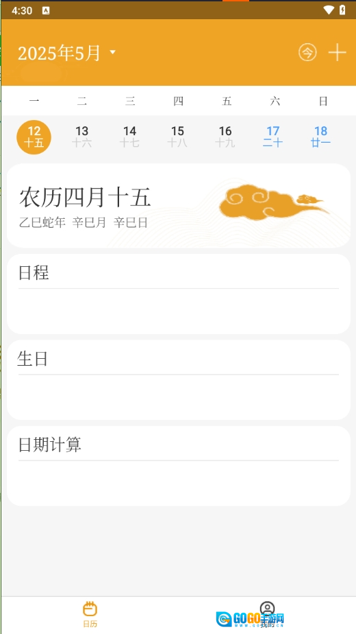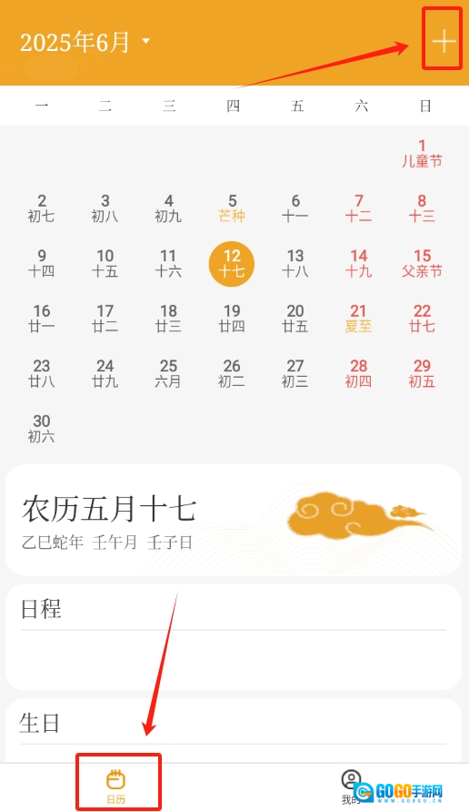1、启动祥瑞日历应用后,简洁的首页便呈现在眼前,在页面的右上角有一个小小的加号按钮,点击该按钮。