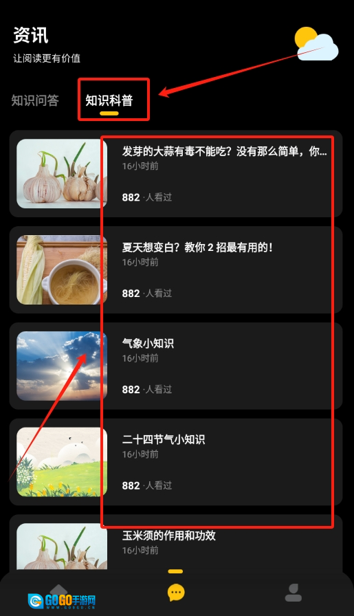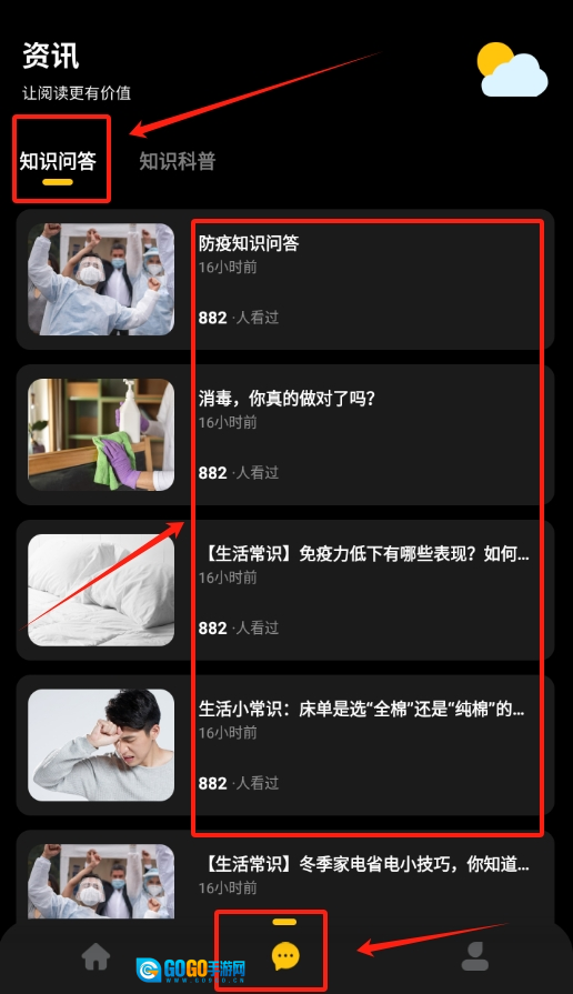 2、找到软件底部的菜单栏,点击“资讯”选项,页面会立刻展示各类生活知识问答,能让你增长不少生活见识。