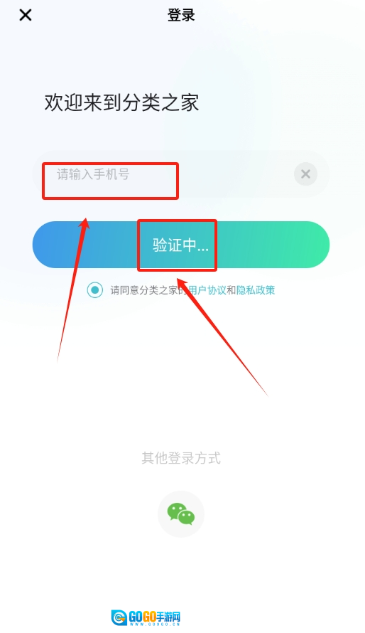 1、 进入分类之家应用,在首屏找到“登录”板块,输入个人手机号,通过获取并填写验证码的方式完成登录操作。
