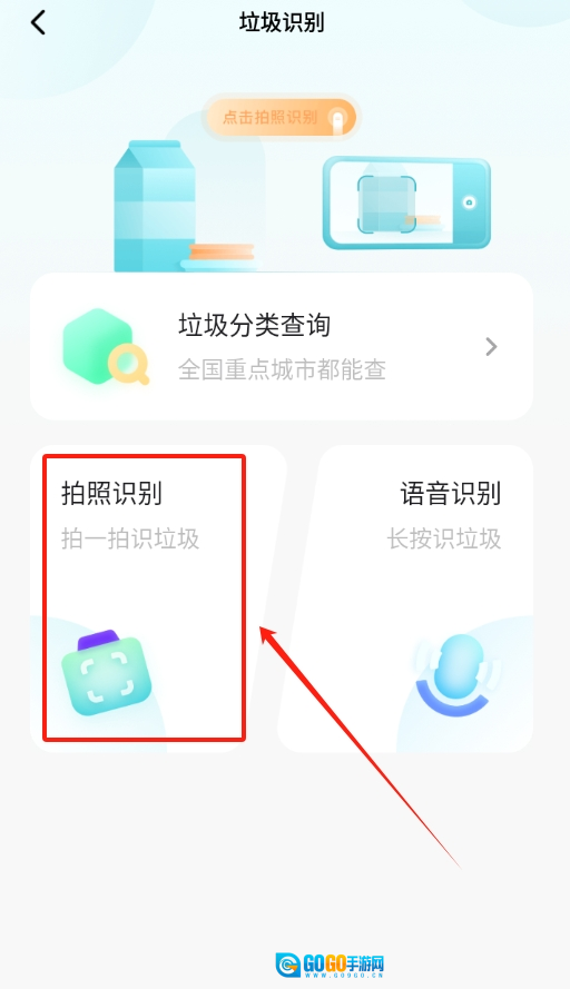 进入垃圾识别页面后,可看到“拍照识别”按钮,点击该按钮并对准垃圾拍照,就能完成识别。