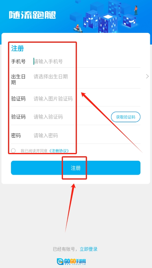 1、在应用商店里搜索“随流跑腿”并进行安装,打开应用后,按照提示完成实人认证以及交易密码的设置流程。