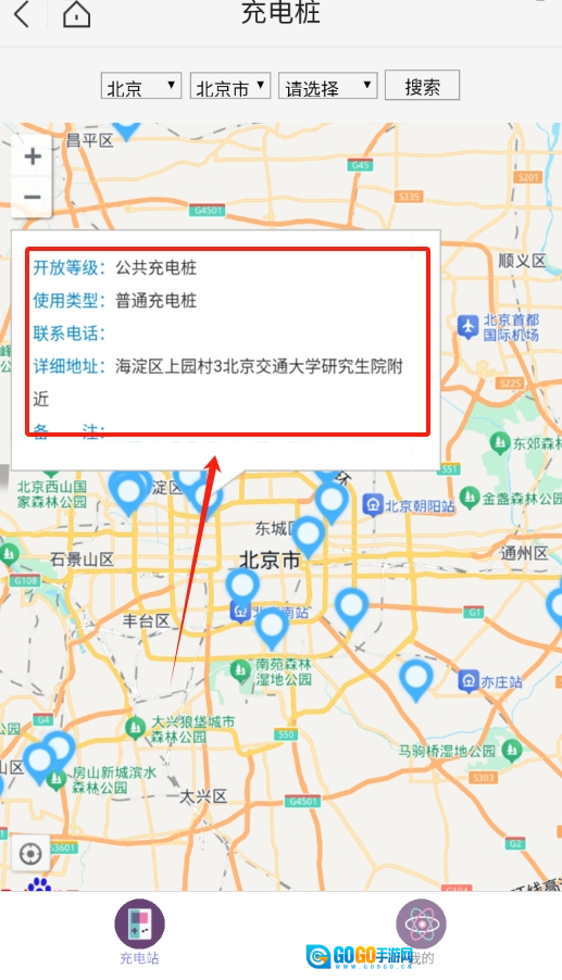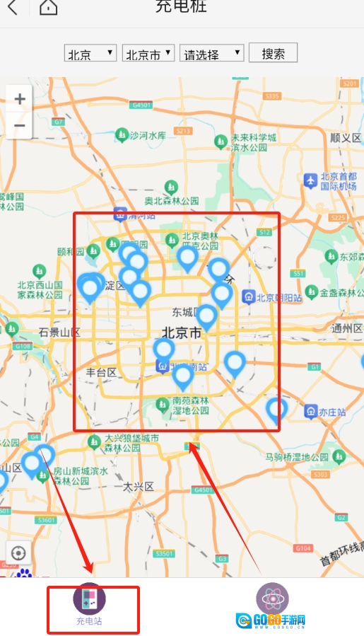 选好地区后返回首页,地图上的蓝色图标代表附近充电桩的具体位置。
