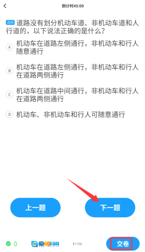 2、点击“开始考试”按钮后,系统会随机生成一套完整的科目一模拟试题。