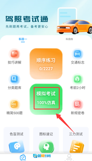 1、打开科目一快速通应用后,在首页的学习板块里找到“模拟考试”功能并点击,即可进入备考界面。