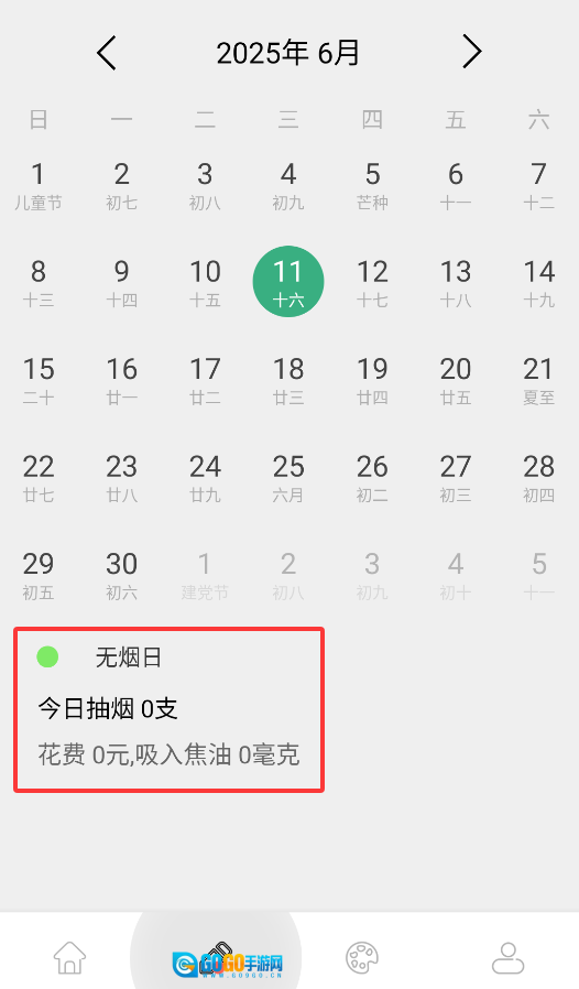 进入日历页面后,用户能够手动记录每天的吸烟状况,系统会自动生成戒烟进度的相关统计。