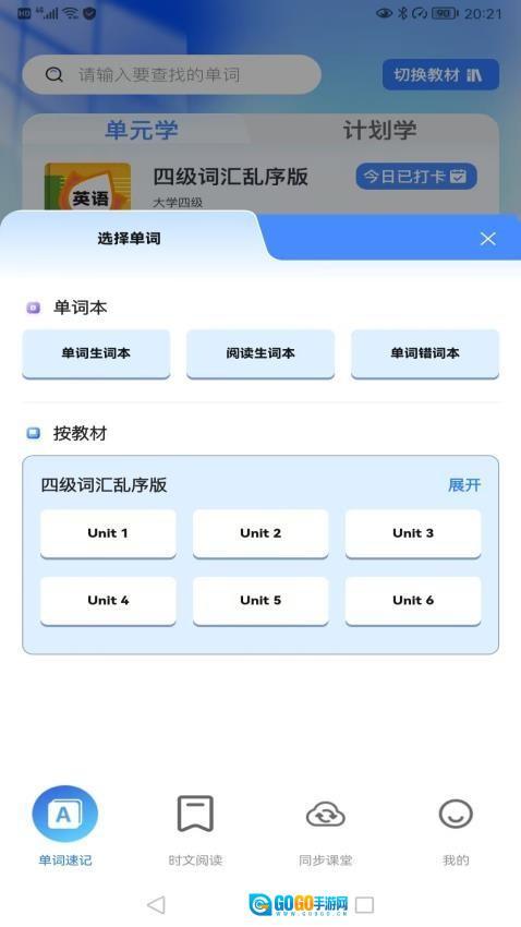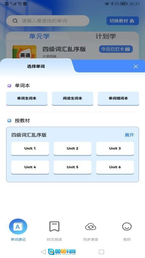 注册登录账号后,选择小学、初中、高中、四六级等适配的学习阶段,系统便会自动推荐匹配的单词词库内容。