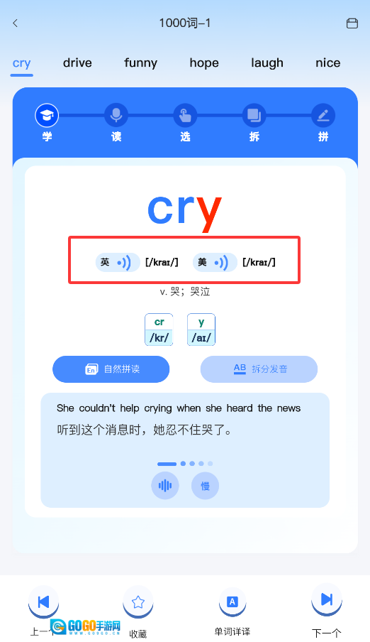 单词详情页配备了英式和美式双版本音标标注,并且支持切换这两种发音进行试听。