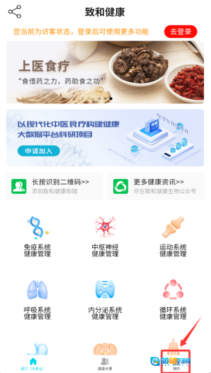 1、打开致和信息健康应用后,在首页右下角找到“我的”入口,点击该入口进入账户管理页面。