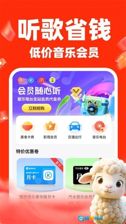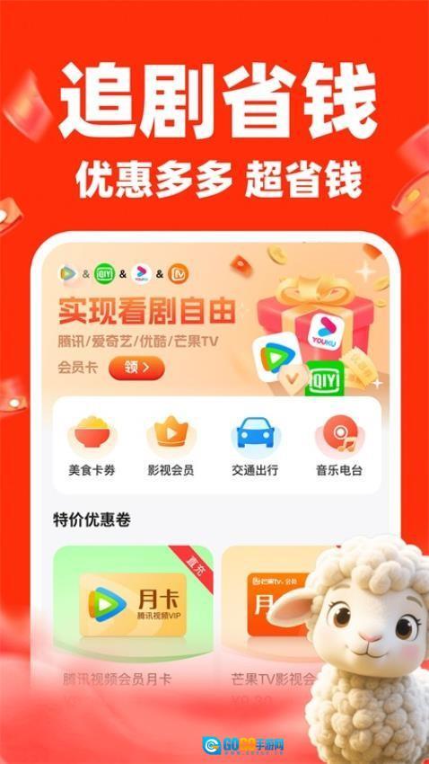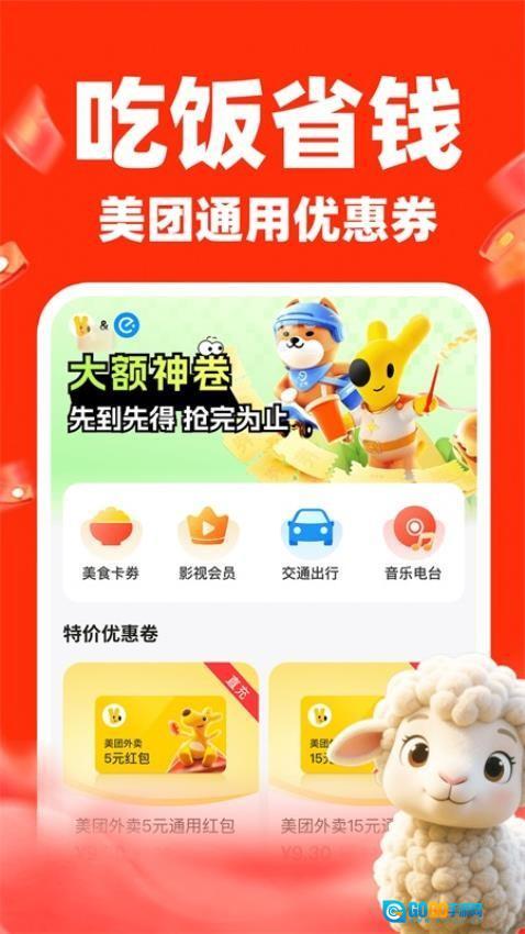 1、整合全网高性价比的优惠资源渠道,覆盖外卖、音乐、影视、出行等各类消费场景,一站式满足用户多方面的省钱需求。