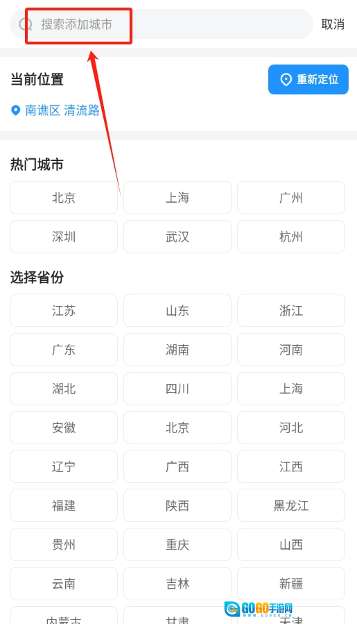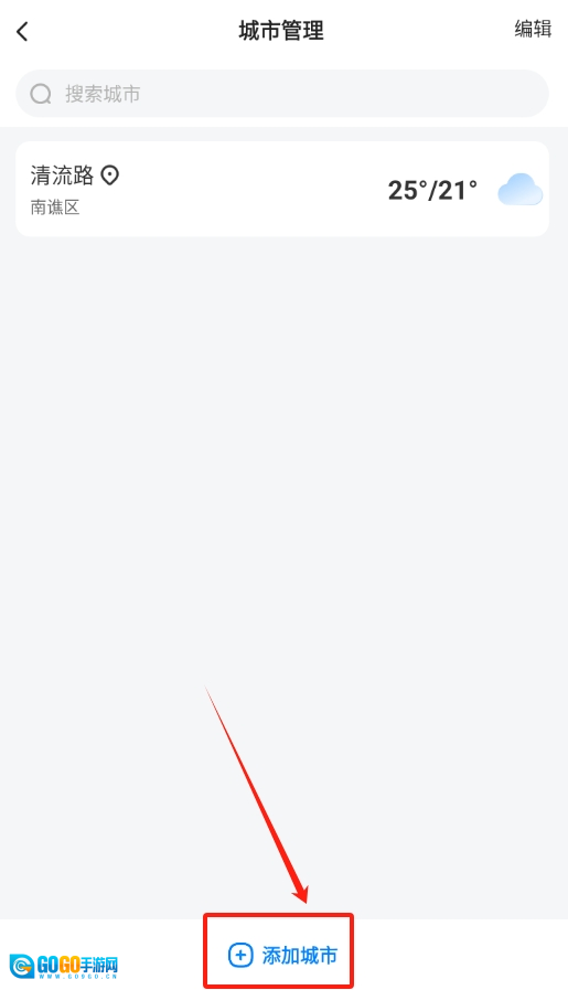 2、在弹出的菜单中点击“添加城市”选项,以便输入你想要关注的地区。
