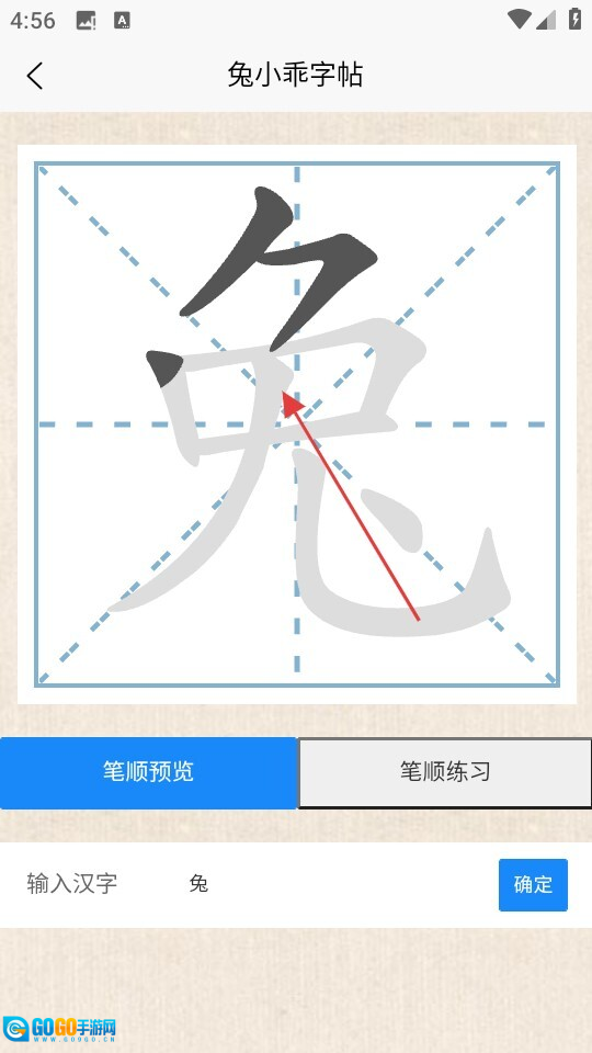 4、在练习界面,用户能够对汉字的笔顺进行预览与练习,输入汉字并点击【确定】按钮后,即可查看该汉字的笔顺。
