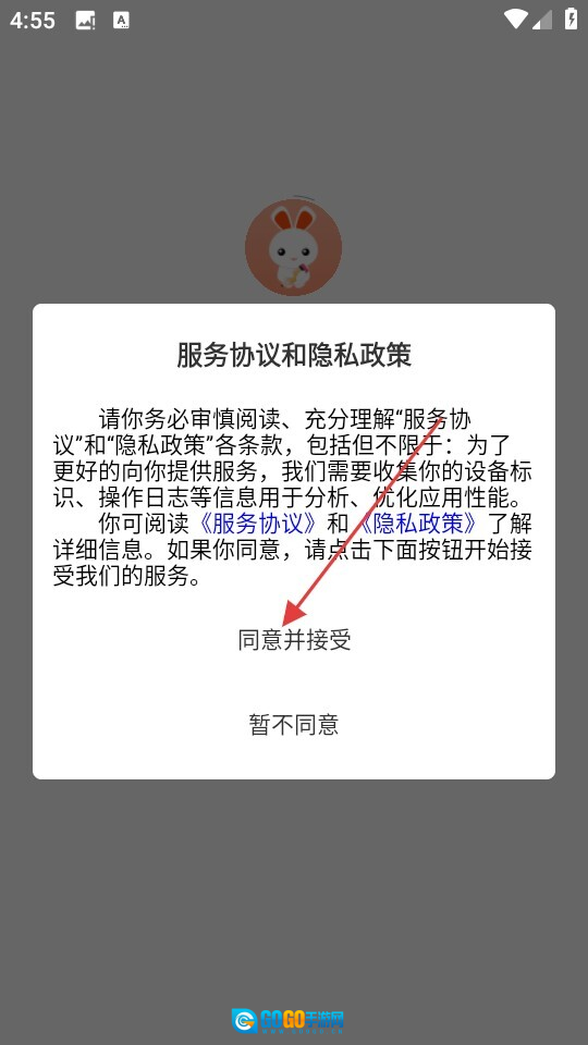1、打开后仔细阅读【服务协议和隐私政策】,然后点击【同意并接受】按钮。