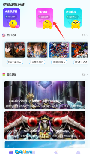 启动应用后,在主页面点击顶部的“今日推荐”栏目,该栏目会展示最新的热门作品以及专题分析内容。