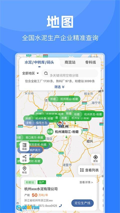 3、借助地图模块查看周边建材企业的分布情况,点击标记即可获取详细的联系方式与产品报价。