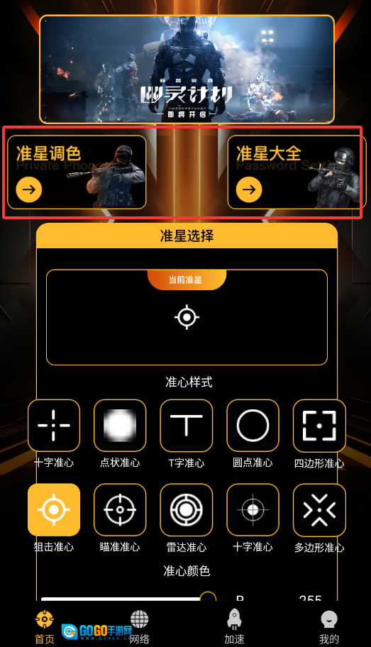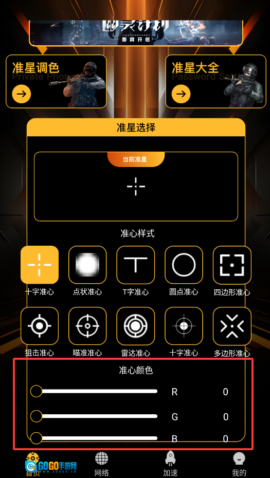 1、打开瞄准实验室pro后,进入“准星选择”界面,即可对包括准星颜色、形状在内的各项视觉参数进行自定义设置。