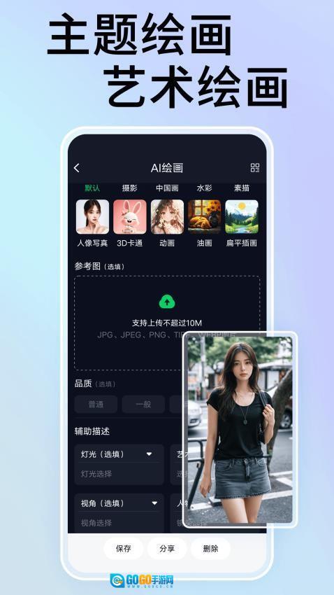 1、智能生成引擎具备文本转图像与图像转图像两种模式,无论是输入关键词还是上传参考图,都能生成别具一格的艺术作品。